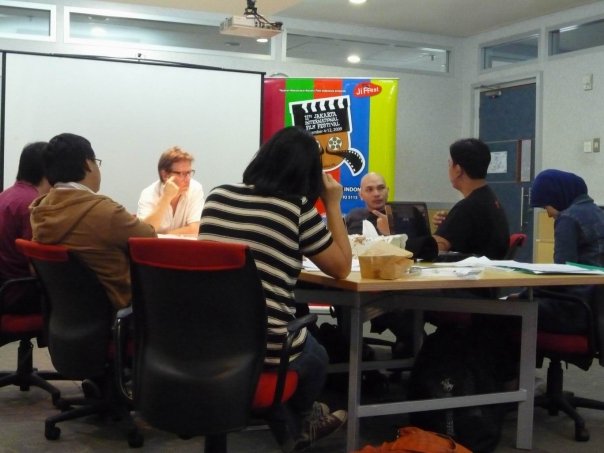 [Dec 4th 2009] It’s the first day of the festival. Though the opening movie been started at 07.30 pm, i had to arrange JSDC (Jiffest Script Development Competition) from 9pm til 5pm with my team. They’re Damar and Cipi. I was late 1 hour on my first day! Haha..The traffic from Bekasi to Senayan on Monday was kreyzee (as usual!). Well, JSDC is a kind of workshop about screenplay. People sent synopsis and treatment of their story then we selected six finalist. They had a chance to discuss it with David Weber from USC. How lucky they are! Only great and unique story could pass the selection.