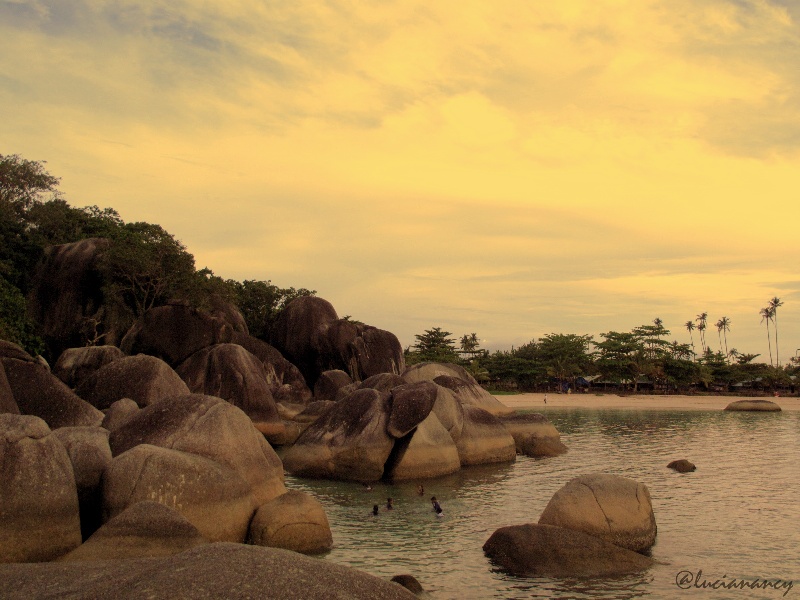Hamparan batu-batu besar di Pantai Tanjung Tinggi membuat kami berdecak kagum. Tangan Tuhan begitu apik mengatur letak dan pesona setiap batu di pantai Belitung Barat.