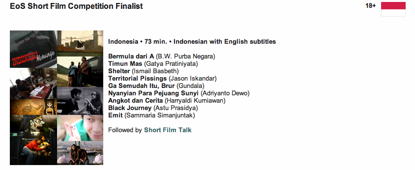 Tahun ini EoS juga mempersembahkan 9 film pendek Indonesia terbaik melalui EoS Short Film Competition.