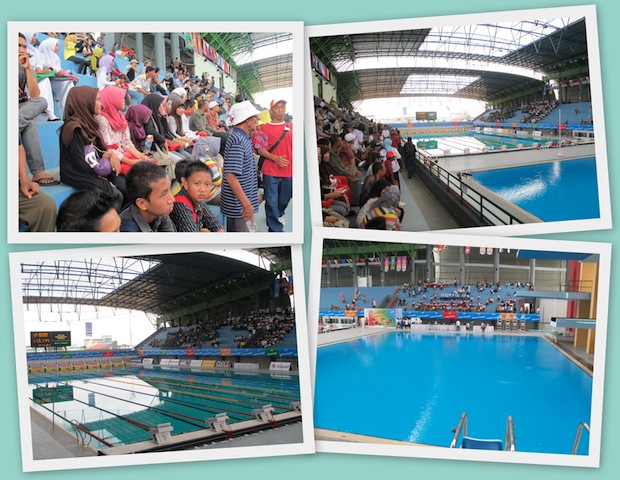 Sebagai orang yang lebih akrab dengan kolam renang dibanding dengan arena olahraga lainnya, saya sangat senang ketika venue yang kita kunjungi pertama kali adalah Stadium Aquatic Jakabaring. Arena kolam renangnya sangat menyenangkan terutama karena atapnya tertutup, berbeda dengan kolam renang di Gelora Bung Karno yang terbuka. Bukannya ingin membandingkan, tapi memang alangkah lebih baik jika aktivitas latihan dan pertandingan jadi tidak terganggu meskipun hujan datang bukan?