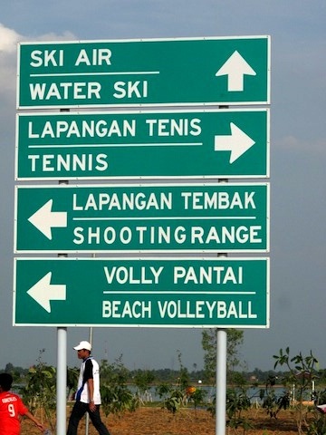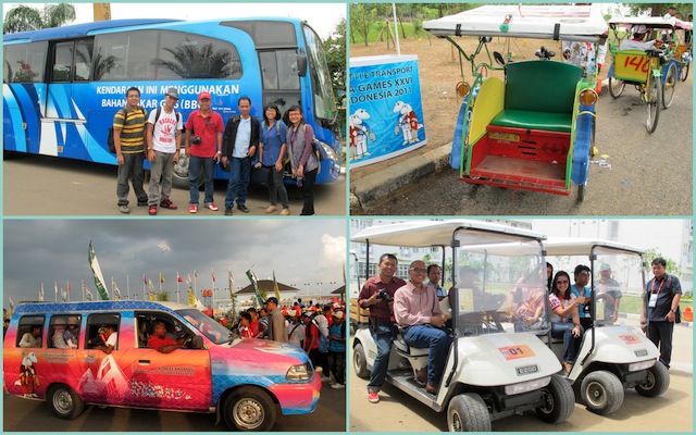 Tadinya kami berencana menonton pertandingan menembak setelah menengok Stadium Aquatic, tapi karena ada jadwal yang berubah mendadak, alhasil kami berkeliling arena Jakabaring dan melihat berbagai fasilitasnya. Sebagai bayangan, arena Jakabaring itu kurang lebih sama seperti Universitas Indonesia. Jarak dari satu tempat ke tempat lainnya lumayan jauh, namun ada juga yang bisa ditempuh secara cepat dengan jalan kaki. Eits, tapi jangan khawatir, ada 5 kendaraan yang disediakan secara gratis untuk mengelilingi Jakabaring selama Sea Games, yaitu: angkot, becak, sepeda, bis, dan golf car.