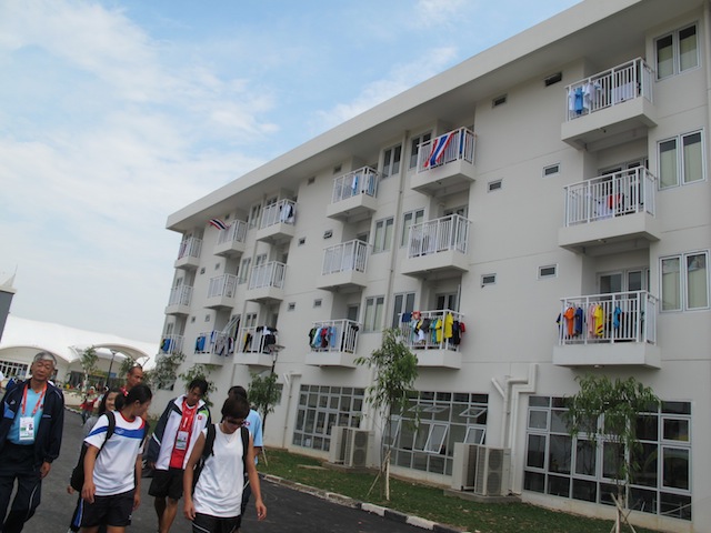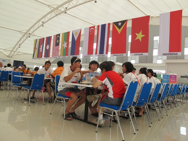 Setelah mengunjungi Stadium Aquatic, kami diajak untuk melihat area atlet. Saya salut dengan prosedur yang diterapkan secara tertib oleh para polisi penjaga di sana. Saya dan pasukan Noordin (ya, begitulah para tukang becak menyebut kami) yang tidak memakai name tag khusus tidak dapat masuk begitu saja meskipun kami datang atas titah sang gubernur. Karena sepertinya belum ada konfirmasi dari beliau, alhasil kami bisa masuk tanpa nametag namun tidak bisa mengobrol dengan atlet-atletnya. Eitsss, tapi jangan kecewa, di artikel berikutnya di hari kedua, kami semua bebas berkeliaran dan ngobrol dengan siapapun yang ada di dalam area atlet. Kalo kata Pak Alex “Siapa yang bilang nggak boleh? Tenang saja, ada saya. Ngobrol saja dengan mereka sepuasnya.” Dan kami pun tertawa dengan jumawa. Haha..