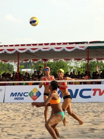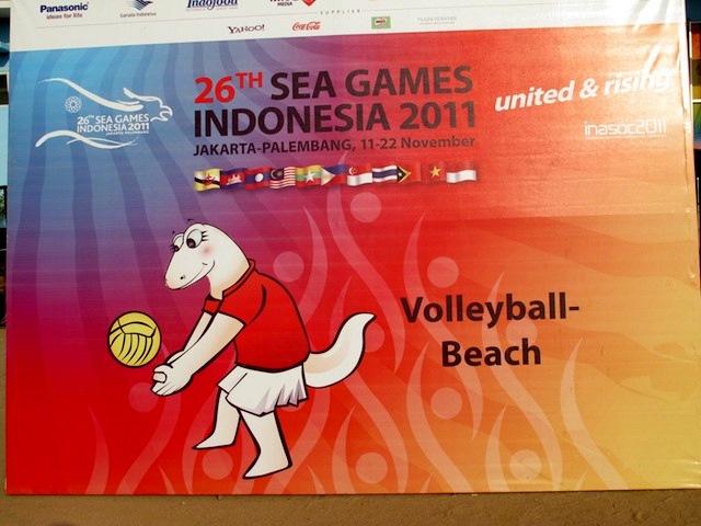 Destinasi kami selanjutnya adalah arena pertandingan voli pantai. Wihiii seru deh ada lapangan berpasir di tengah kota. Inilah keunggulan Jakabaring, semua arena dibangun di tengah kota, bahkan sampai arena ski airnya sekalipun. By the way, karena saya dulu sempet jadi atlet-atletan di cabang voli ketika masih sekolah, rasanya seneng banget liat bola Mikasa. Bawaannya pengen service & passing. Norak ya! haha.. Anyway back to topic, saat kami datang, pertandingan yang sedang berlangsung adalah voli pantai putri Indonesia melawan Vietnam. Agak gregetan juga sih nontonnya. Di set pertama, saya udah kesenengan aja karena Indonesia menang dengan perbedaan poin yang cukup jauh dengan Vietnam. Saya sempet mikir “ah cemen nih Vietnam, palingan 2 set juga udah kelar pertandingannya”.